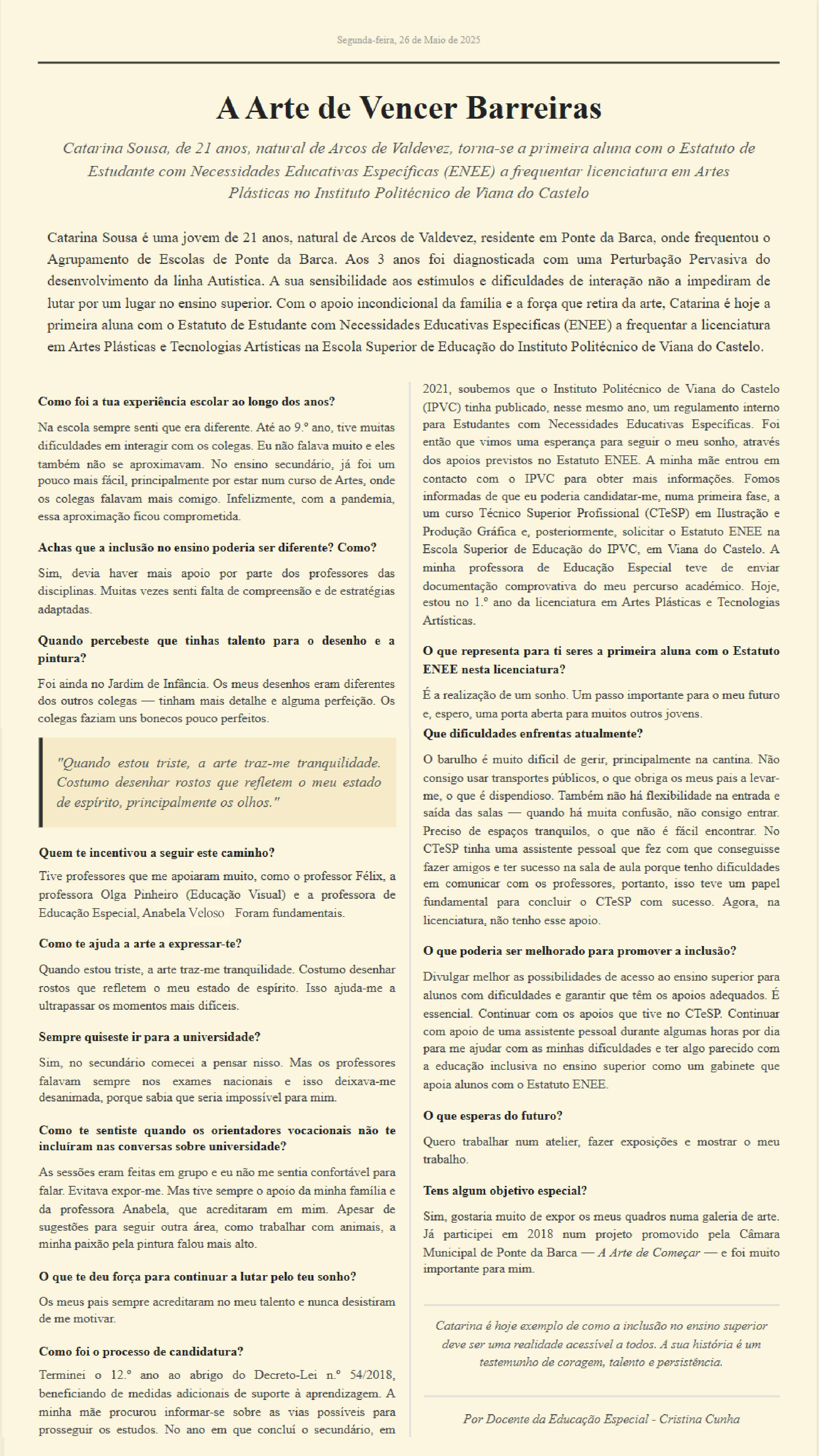 No Dia Internacional das Pessoas com Deficiência, o Agrupamento de Escolas de Ponte da Barca destaca o percurso inspirador de Catarina Sousa, ex-aluna que ultrapassou desafios com determinação e talento. Hoje, é a primeira estudante com Estatuto ENEE a frequentar a licenciatura em Artes Plásticas e Tecnologias Artísticas no IPVC. A sua história recorda-nos a importância de uma escola inclusiva, onde cada aluno encontra apoio para alcançar os seus sonhos.