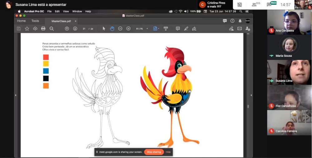 Num segundo momento, partilhou com os alunos e respetivos professores a sua dinâmica criativa, nomeadamente a técnica do desenho / ilustração digital, o processo de criação de cenários e de personagens e o ambiente digital em que as realiza.