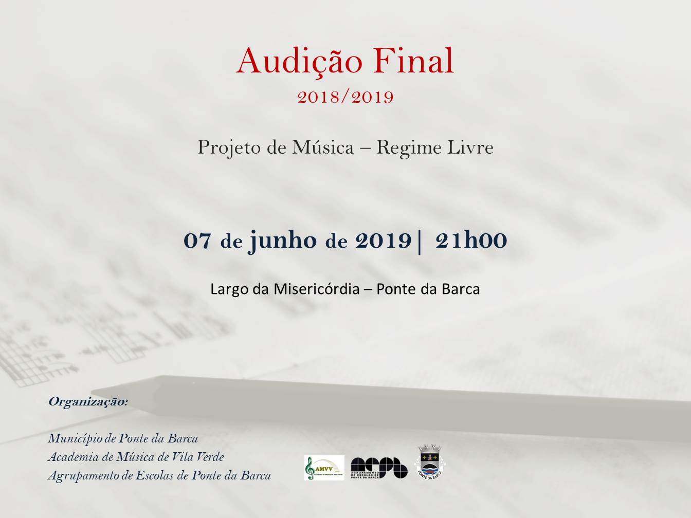 No âmbito do Protocolo entre o Agrupamento de Escolas de Ponte da Barca, a Câmara Municipal de Ponte da Barca e a Academia de Música de Vila Verde, convida-se a comunidade escolar para a audição final dos alunos do Projeto de Ensino da Música em regime livre, em Ponte Barca, no dia 7 de junho.