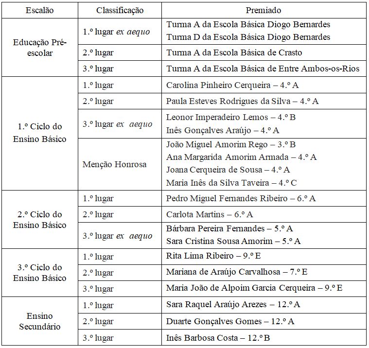 Eis os galardoados nesta atividade, promovida pelos Departamentos da Educação Pré-escolar, 1.º Ciclo e Línguas, em articulação com a Biblioteca Escolar e com o patrocínio da Câmara Municipal: