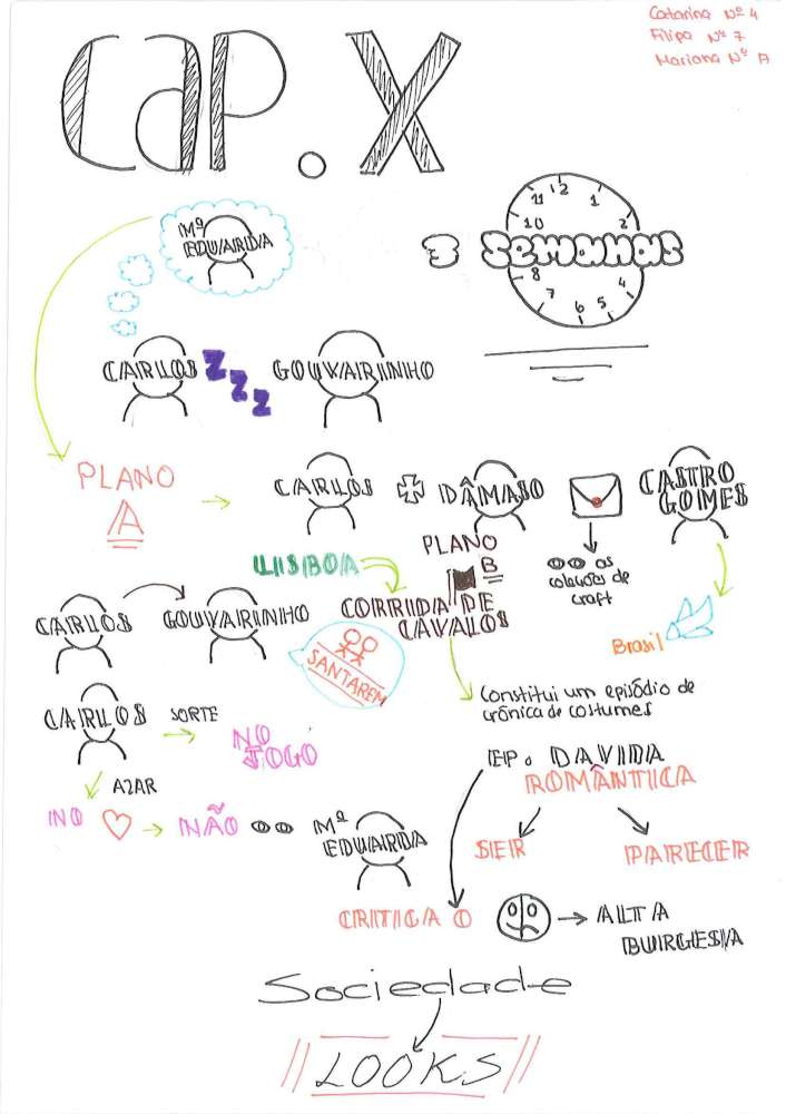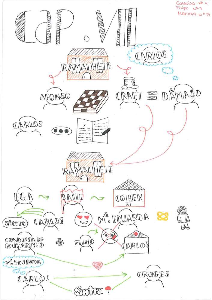 Em complemento do trabalho de apresentação oral, as alunas Catarina Cerqueira, Filipa Cerqueira e Mariana Rodrigues sintetizaram os capítulos em estudo, com um roteiro icónico que desenharam no quadro e distribuíram aos colegas e professora.