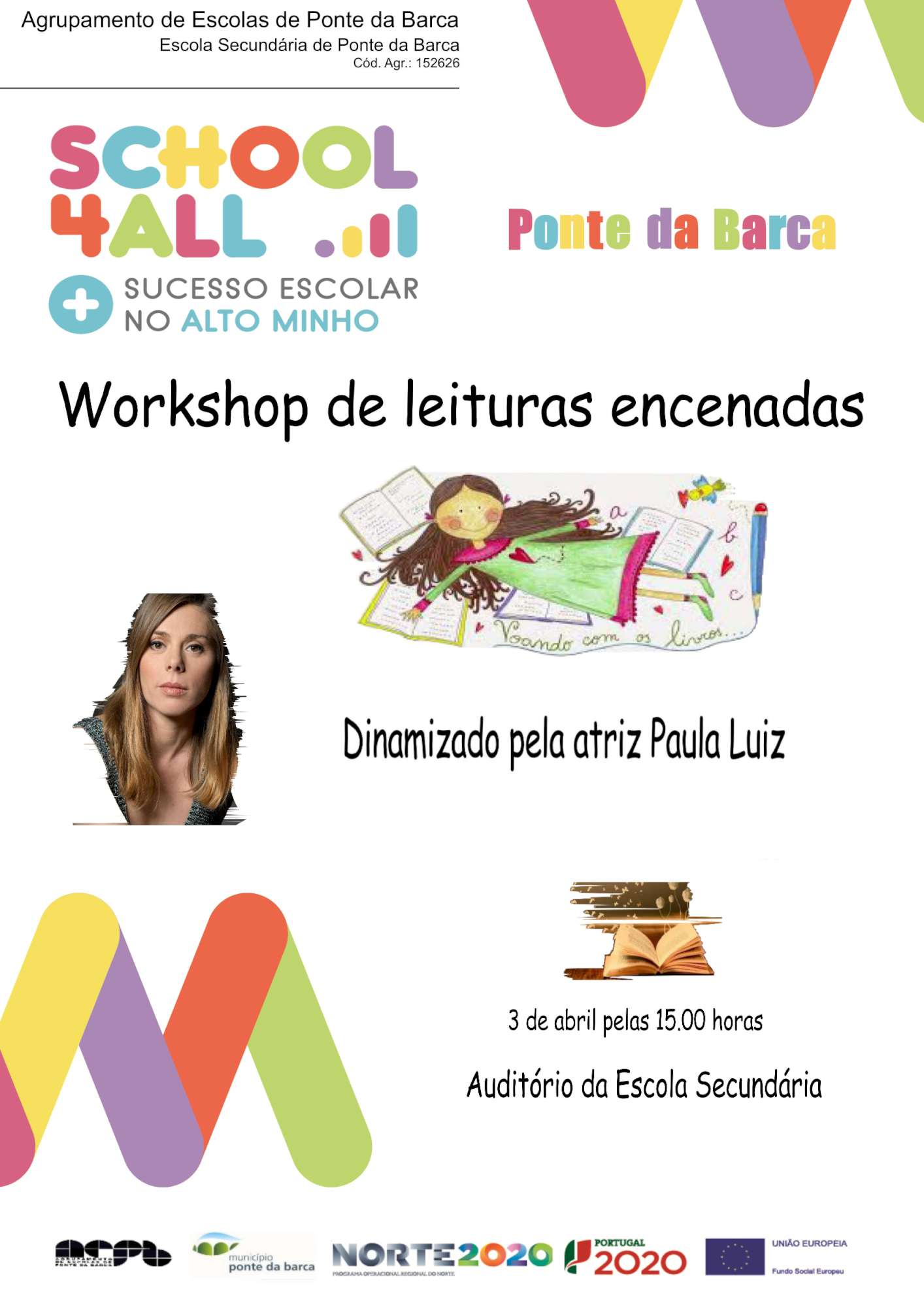 No âmbito do Projeto School4all, vai decorrer no dia 3 de abril, às 15 horas, no Auditório da Escola Secundária, um Workshop de Leituras Encenadas, dinamizado pela atriz Paula Luiz.