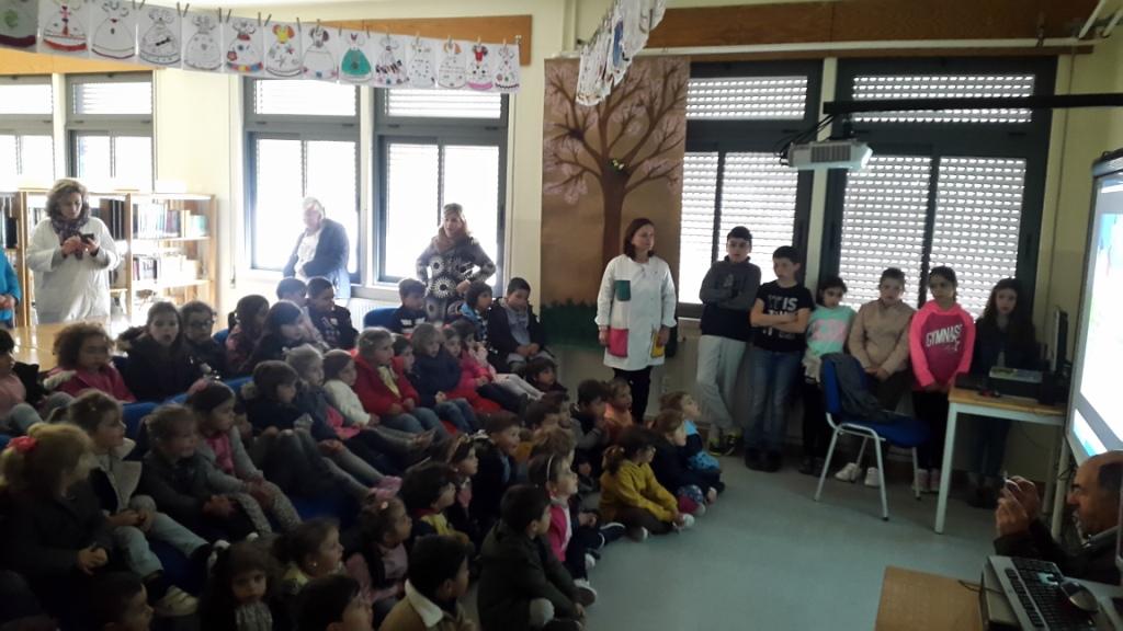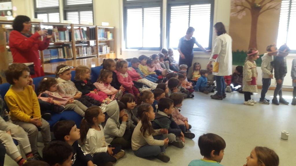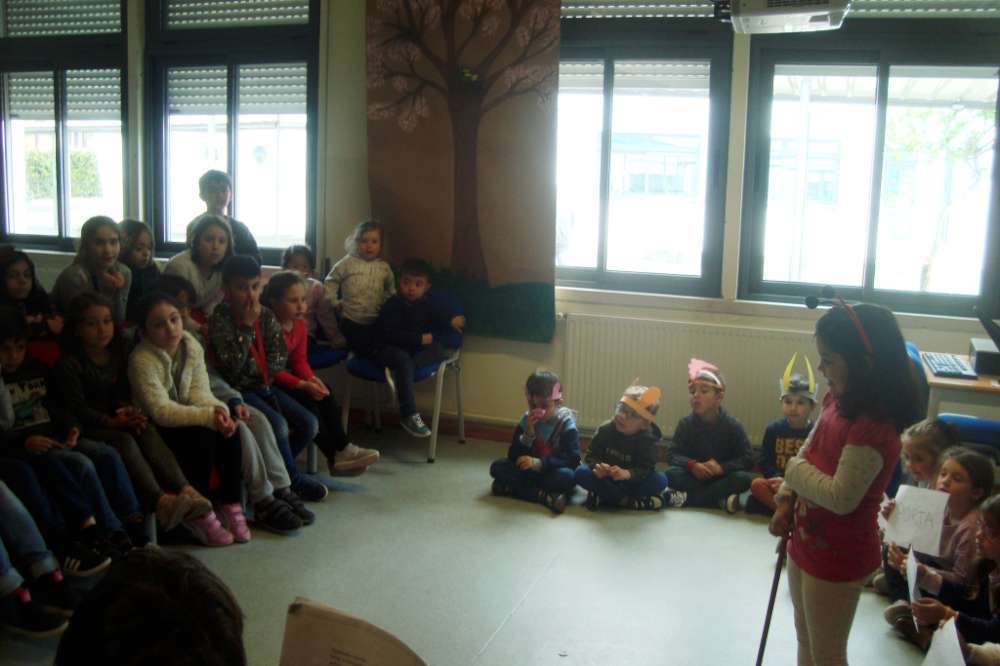 As crianças da turma prepararam e dramatizaram a história “A Carochinha e o João Ratão”, de Luísa Ducla Soares, para as turmas do Pré-escolar e para duas turmas do 1.º ciclo, na biblioteca da escola.